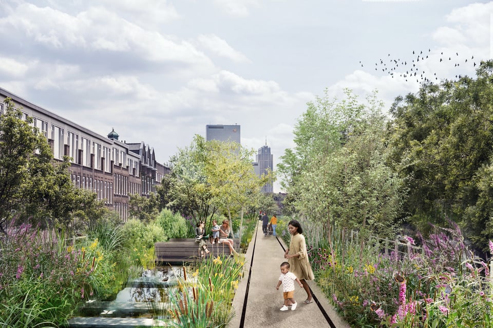 Hofbogenpark in the ZOHO district, featuring green infrastructure. (© De Urbanisten / DS landschapearchitects.)