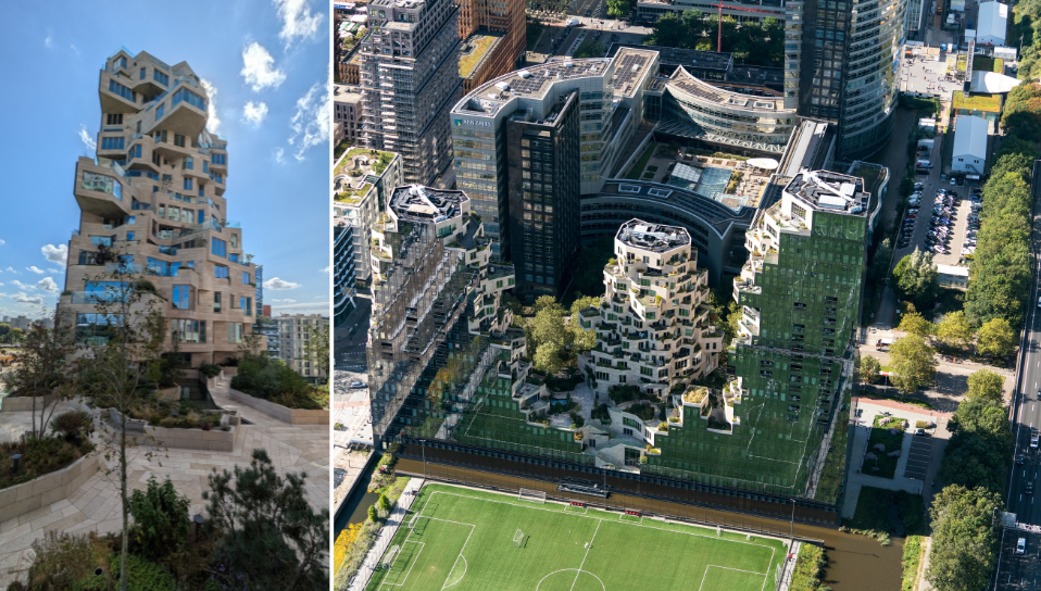 Left: Views of the rooftop and balcony greenery at Valley, the internationally renowned high-rise complex. Right: Zuidas redevelopment district, featuring roadways converted into green spaces and high-rise buildings with rooftop and balcony greening. (© Aerovista Luchtfotografie / Shutterstock)