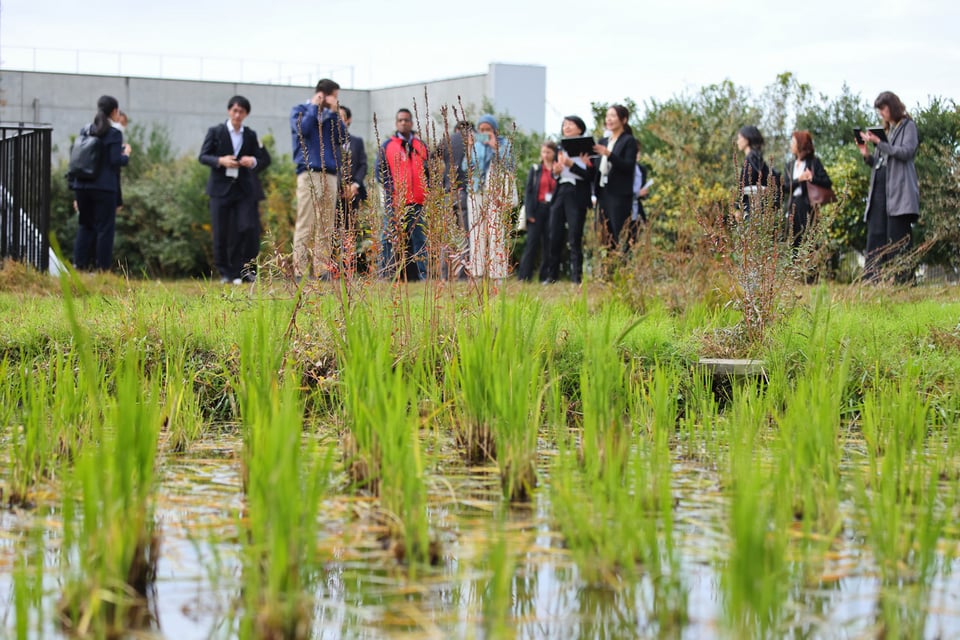 内部には昭和初期の目黒川周辺の原風景をモデルに水田や雨水を循環させた川が設置され、約460種の動植物が確認されており、視察時にも放流された生きものだけでなく、チョウやハチ、アオサギなどが見られました。